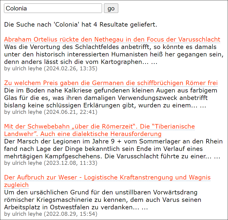Vor allem eines, dass mehr Argumente dafür als dagegen sprechen und diese Region zum Favoriten macht. Doch wer sich hier eine schnelle Antwort in Sachen Varusschlacht erhofft muss enttäuscht werden, denn ein 2.ooo Jahre alten Rätsel lässt sich nicht im Handumdrehen lüften. So mussten alle Register gezogen werden und der Ungeduldige sollte sich auf ein akribisches Vortasten quer durch alle bisher erschienenen Kapitel aber auch die unterschiedlichsten Forschungszweige einlassen. Aber dann darf er sich auf die Möglichkeit einstellen, dass die Schlacht parallel zur Nethe statt gefunden haben könnte. Ein Fluss der zum Schicksal der römischen Armee wurde und sie in den Untergang begleitete. Ein Fließgewässer das im vielleicht ruhigsten Winkel der Republik durch eine Region floss in der sich in Anspielung auf die Zerstörung der Irminsul die frühen Ereignisse die Hand gegeben haben könnten. Es ist eine Theorie auf deren Stichhaltigkeit in diesem Internet Buch seit 2017 in über 150 Beiträgen auf vielen hundert Seiten hin gearbeitet wurde. Wer sich nun ein näheres Bild verschaffen möchte und daher studieren will was bislang und zu welchem Themenkomplex abgehandelt wurde, der sollte sich wenn es ihm an Zeit mangelt das Kapitel seiner Wahl aufrufen. Dabei hilft die Möglichkeit der Suchleiste die der Blog bietet. Und desto präziser die Wortwahl ausfällt, desto höher ist auch die Wahrscheinlichkeit also die Trefferquote möglichst schnell auf den gesuchten Abschnitt zu stoßen. Worte wie Tacitus tauchen zwangläufig häufiger auf und sollten daher vermieden werden. Wählt man aber einen Begriff wie etwa „Colonia“, dann bietet das System wie man selbst testen kann vier Kapitel an in denen dieser Name erscheint und es fällt leichter sich das Gesuchte aufzurufen. Bei dem Wort „Manilius“ wird es schon problematisch, denn auf diesen Geschichtsschreiber wurde in 14 Kapiteln näher eingegangen.